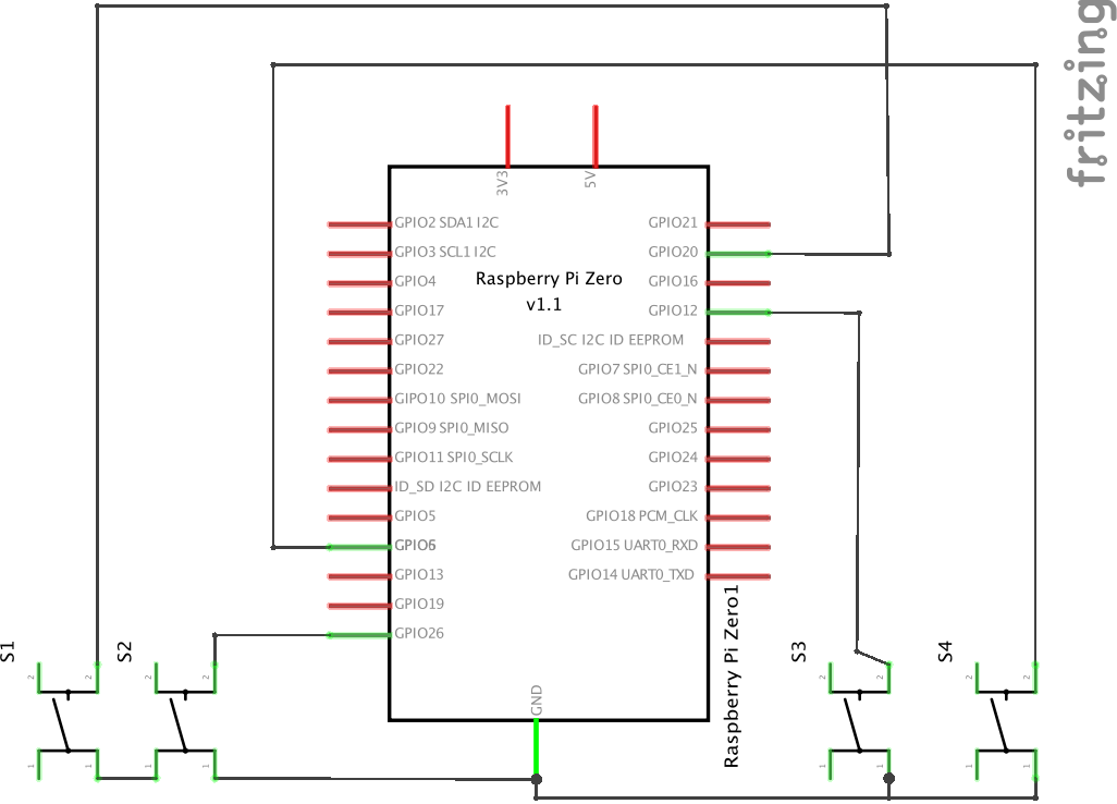 Since Scroll pHAT display interface only requires the SCL and SDA pins for communication, all other GPIO pins are fair game for us to connect to. For this project we'll use GPIO26, GPIO20, GPIO6 and GPIO12 as our control inputs.