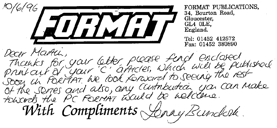 This was the first & only article I wrote on C for FORMAT magazine. There was plenty of interest – I got some letters from readers, which at the time was pretty mind-blowing. But school got in the way & it would be years before I returned to technical writing.